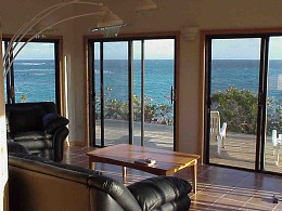 Aarons Ferienhaus liegt auf einem Hang mit Ausblick über den Sandstrand. In der Nähe liegen Riffs, ideal zum tauchen.